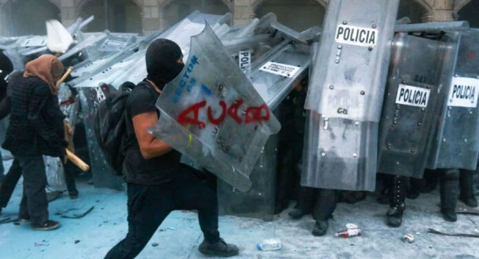 Los integrantes del “bloque negro” provocaron disturbios en los locales del centro capitalino, además de utilizar distintos objetos, cohetones y petardos, los cuales lanzaron contra el personal de seguridad pública que fue asignado para garantizar la seguridad de los asistentes.