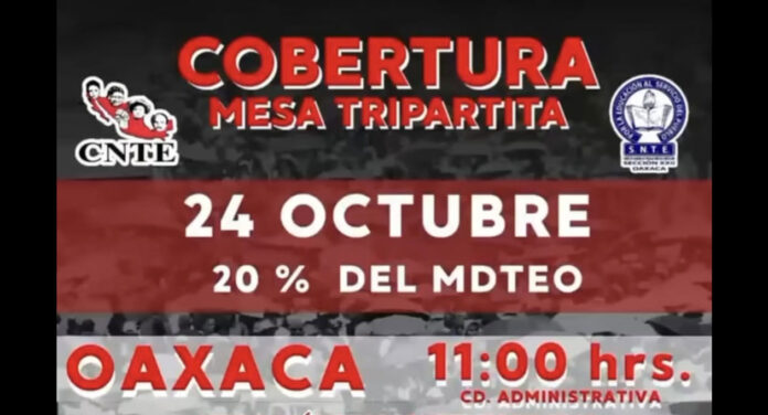 “Al pleno del Comité Ejecutivo Seccional, a la Coordinadora Estatal de Trabajadores de la Educación de Oaxaca, Organismos Auxiliares, Espacios Ganados en Resistencia y al 20% del Movimiento Democrático de Trabajadores de la Educación de Oaxaca, que la Mesa Tripartita programada para el viernes 24 de octubre del presente año se traslada al estado de Oaxaca, teniendo como sede Ciudad Administrativa.