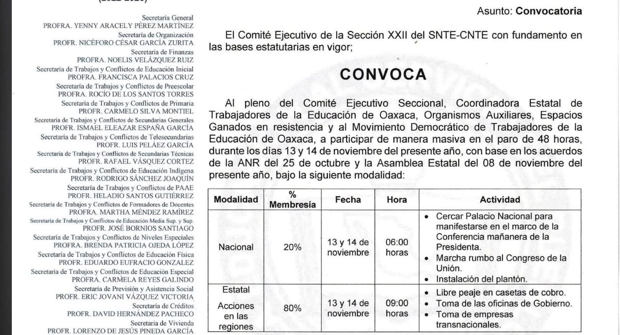 Oaxaca. La Sección 22 de la Coordinadora Nacional de Trabajadores de la Educación (CNTE) anunció esta tarde la realización de tomas de casetas de peaje, oficinas de gobierno y tiendas transnacionales en Oaxaca, en el marco del paro de labores de 48 horas que se llevará a cabo los próximos 13 y 14 de noviembre.