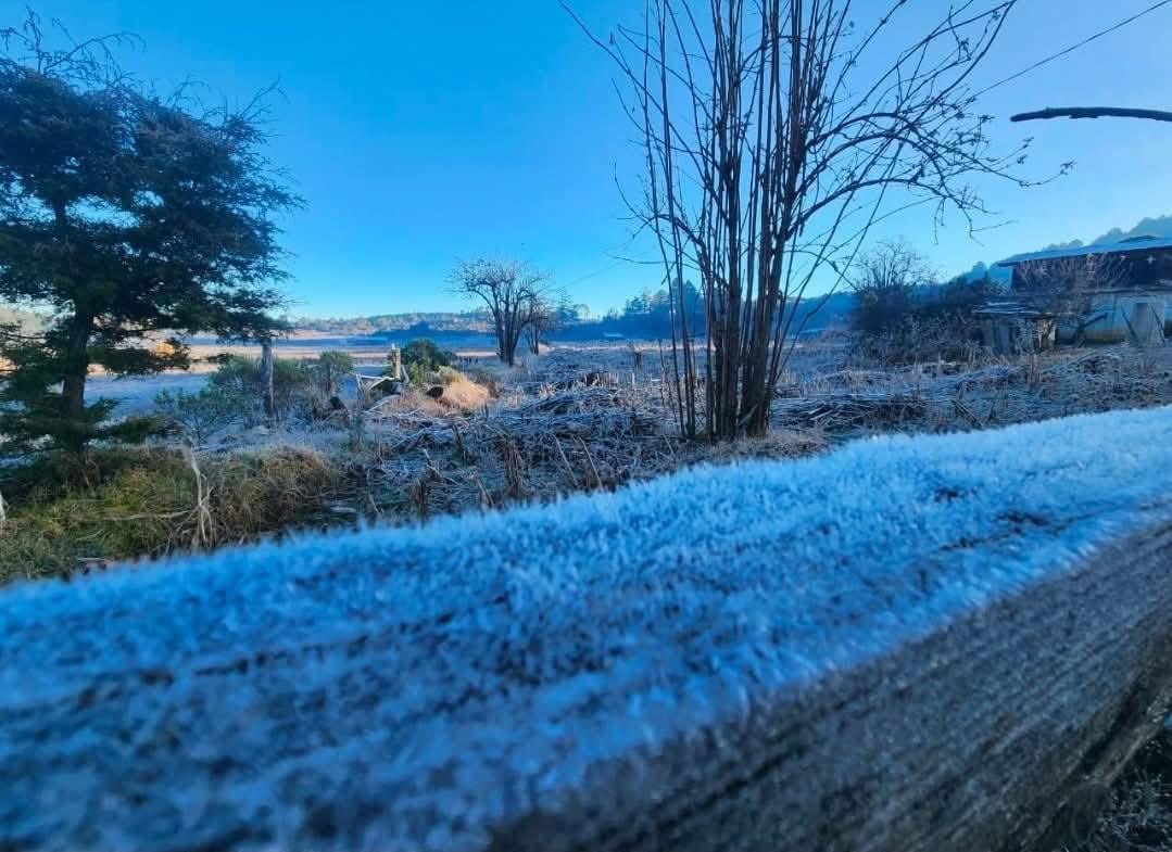 De acuerdo con reportes locales, el paisaje amaneció teñido de blanco por el hielo acumulado durante la madrugada, reflejo del descenso marcado de temperaturas que ya se esperaba para estos días.