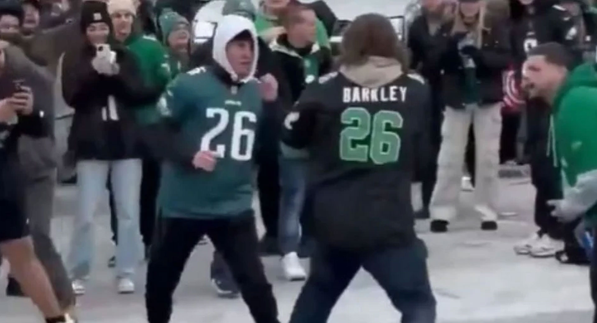 En un video que circula en redes sociales del reportero Dov Kleiman se observa cómo dos seguidores de las Águilas, ambos con el jersey del corredor Saquon Barkley, se enfrentan a puñetazos ante la mirada de otros pares.