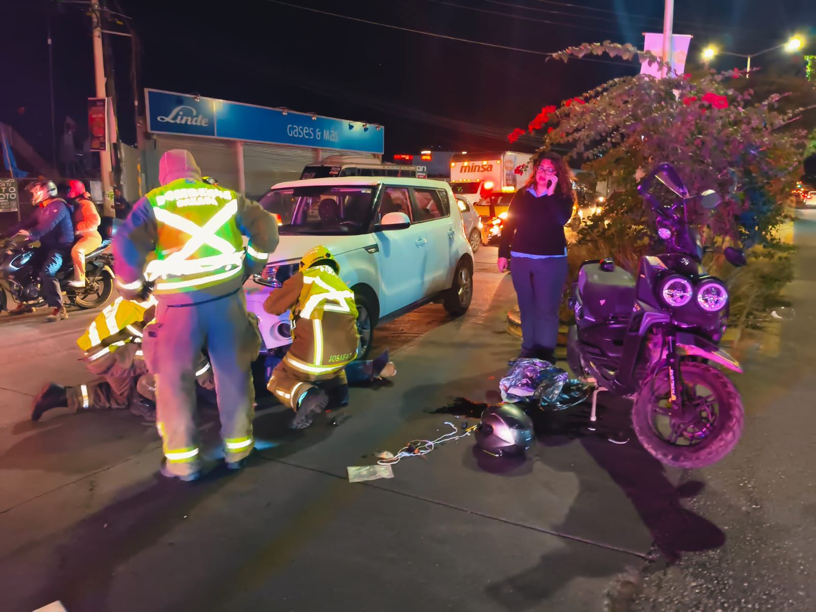 Los vehículos involucrados en el percance fueron una motocicleta Honda, CBR 190, placas de Oaxaca, modelo 2024, color azul con blanco, en la que viajaba el responsable que se dio a la fuga.
