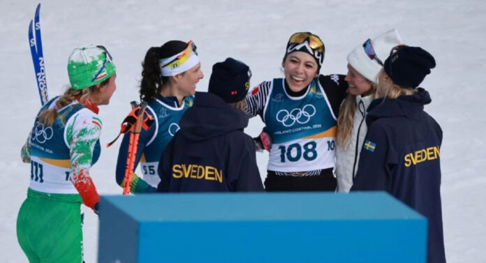 La transmisión de TV siguió el gran esfuerzo de Regina al llegar a la meta, donde fue recibida por las suecas Frida Karlsson y Ebba Andersson, que ganaron oro y plata respectivamente, y la estadounidense Jessie Diggins, que ganó bronce.
