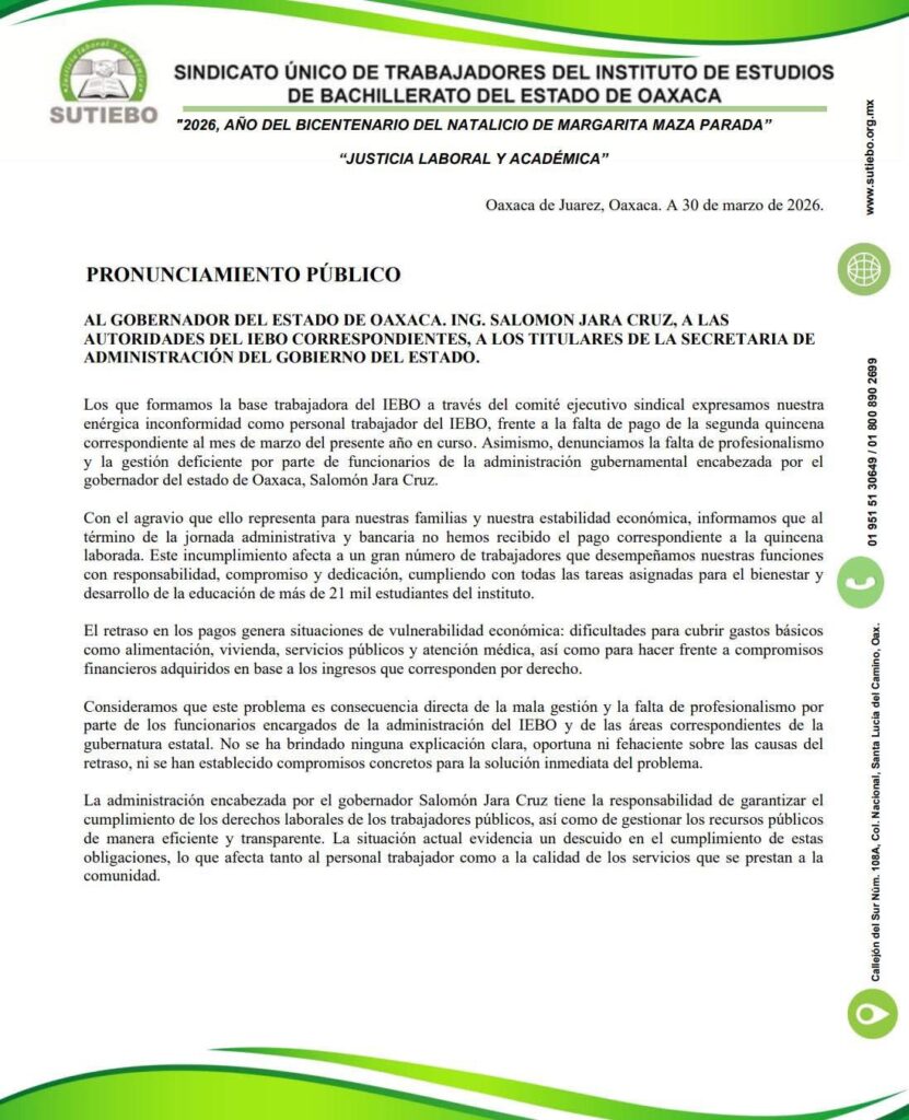 La base trabajadora del Instituto de Estudios de Bachillerato del Estado de Oaxaca (IEBO) denunció el incumplimiento en el pago correspondiente a la segunda quincena de marzo, situación que ha generado inconformidad entre el personal educativo y administrativo.