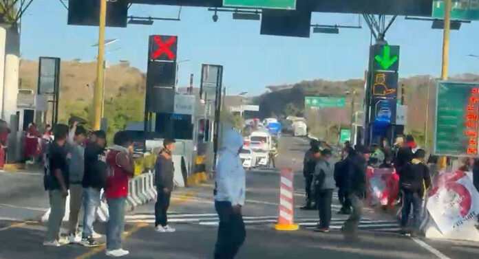 Los manifestantes se instalaron en los carriles, levantaron las plumas de la caseta y permiten el paso de vehículos particulares, de carga y transporte público, a cambio de una cooperación económica.