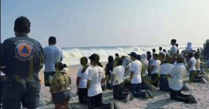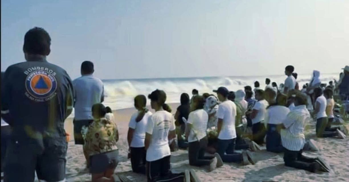 En diversas imágenes divulgadas por medios de comunicación regionales, se observa a personas ataviadas en uniformes de cuerpos de rescate y otras con playeras de color blanco, parados y arrodillados frente al mar de aquella zona de la región del Istmo de Tehuantepec.