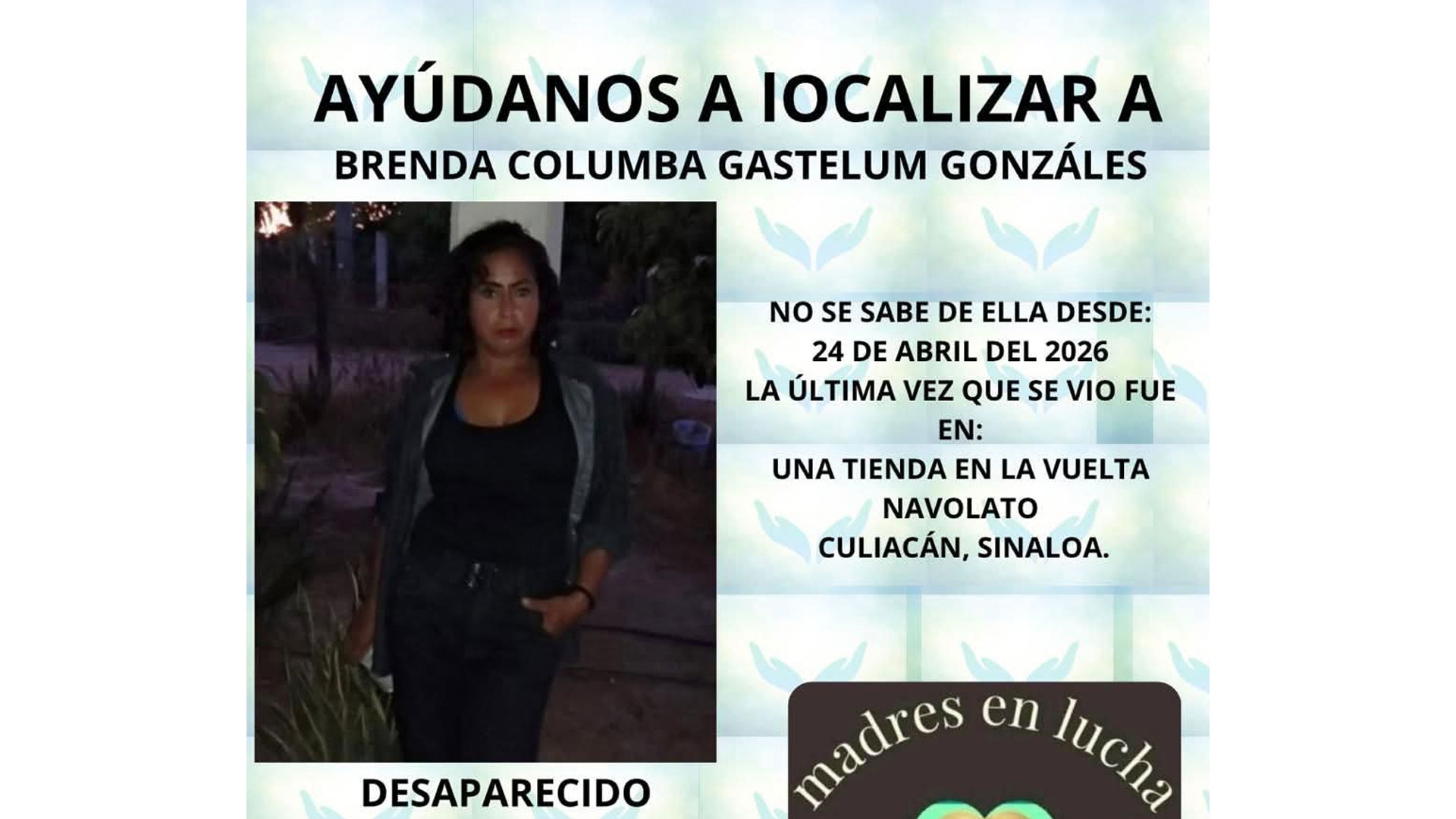 La agrupación de mujeres buscadoras reportó que Brenda Columba dejó de tener contacto con sus allegados este 24 de abril y que la última vez que fue vista permanecía en una tienda en la población de La Vuelta, en Navolato Sinaloa.