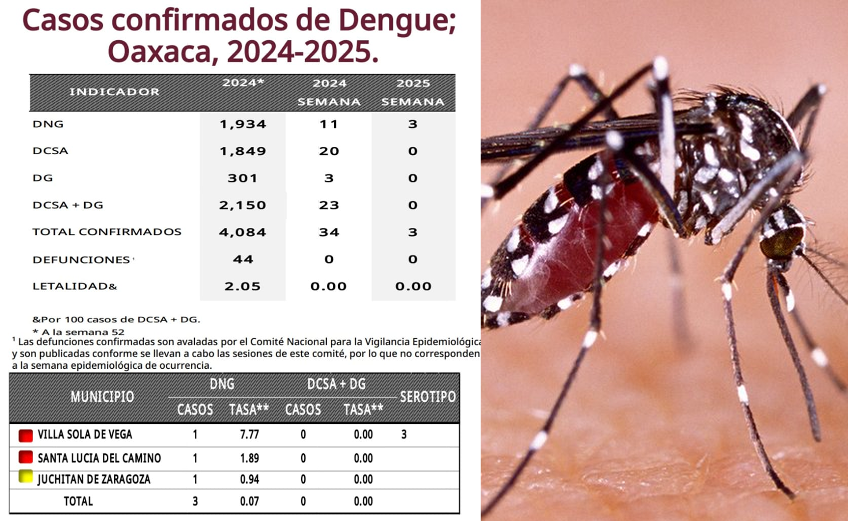Oaxaca. Durante las primeras cuatro semanas de 2025, en Oaxaca han sido confirmados tres casos de dengue; todos, de la variante no grave, confirmó la Secretaría de Salud del gobierno federal.